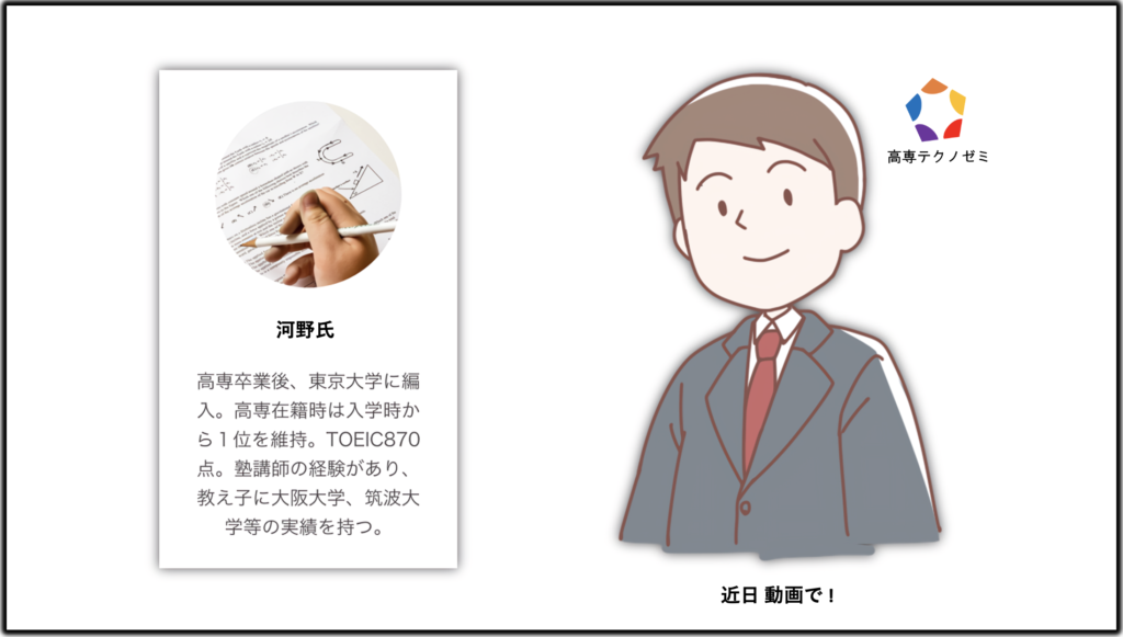 高専テクノゼミ(株式会社 OLIENT TECH) は 高専→東大編入の経歴を持つ河野氏(たににと同年代)が代表となり運営している、高専卒の旧帝大生を中心とした講師によるオンライン家庭教師塾です。